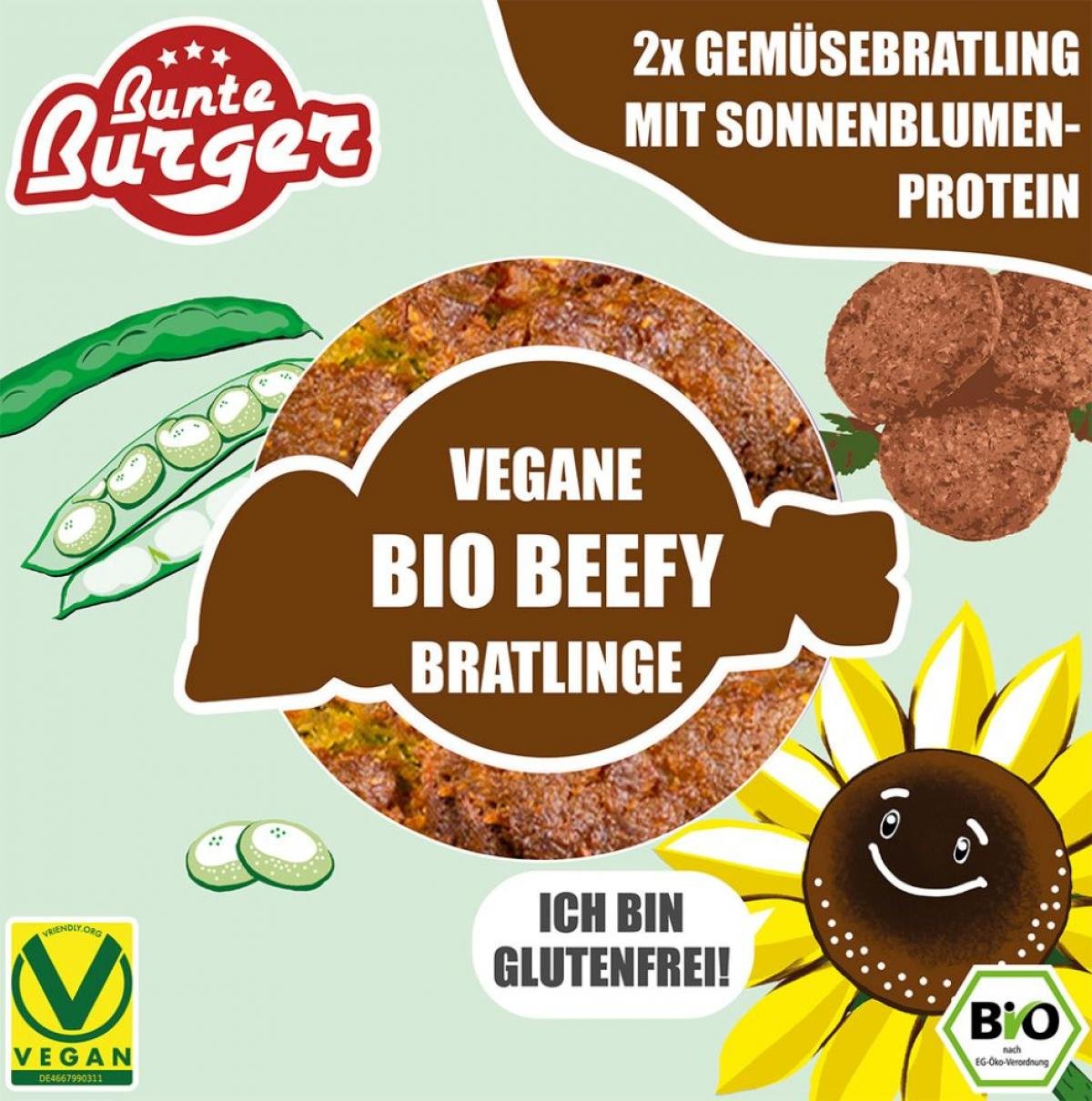 Der Bio Vegane Beefy Bratling ist eine ressourcenschonende und vor allem geschmackvolle Alternative zu herkömmlichen Fleischprodukten ohne dabei Fleischgeschmack zu imitieren. Die einfache Zubereitung und Ausgiebigkeit (2 Stk. je 80g) machen den veganen Gemüse Bratling auf Basis von Sonnenblumenprotein und Ackerbohnenmehl zu einer leichten sowie leckeren Mahlzeit. In seiner Konsistenz ist der Gemüse Bratling innen leicht faserig. Knackige Sonnenblumenkerne runden das Geschmackserlebnis ab. Nach dem Anbraten wird er wunderbar knusprig. Abgerundet wird das Geschmackserlebnis durch eine authentische nussige Note.