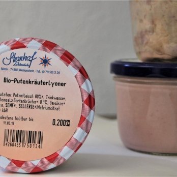 Putenlyoner im Glas mit Gartenkräutern vom Sternhof Weikersholz. Wir liefern immer ohne Pfand. Wir vertrauen darauf, dass Sie uns Flaschen, Getränkekisten, Gläser zurückgeben, da wir für diese Pfand bezahlen.